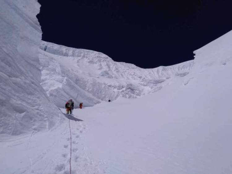 5月10日,登山测量的修路队和运输队从海拔6500米营地出发,向海拔7028米的C1营地前进,并于5月12日抵达海拔8600米的第一台阶,将登山路线修至此处。