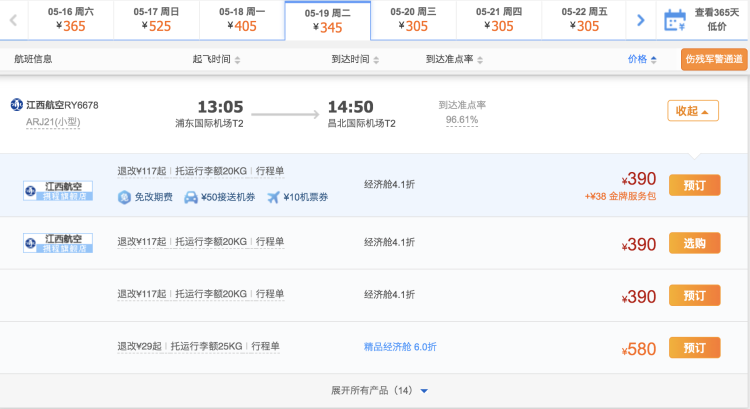 目前,在某售票平台上,该航线5月19日南昌-上海浦东经济舱售价为290元,返程上海浦东-南昌为390元。