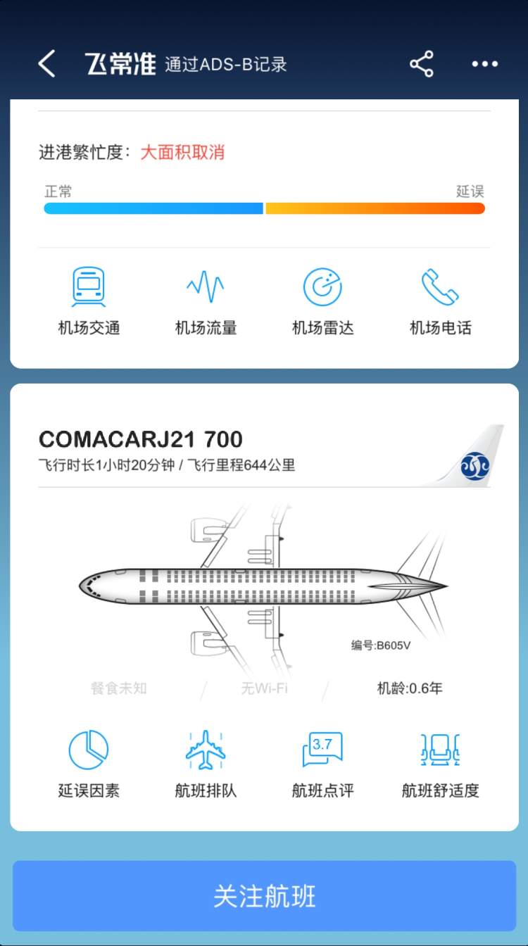 执飞该航班的飞机型号为中国商飞ARJ21-700。ARJ21飞机是我国自行研制的具有自主知识产权的新型涡扇支线飞机,标准航程型满客航程为2225公里,载客78-90座,具有良好的高温、高原性能,特别适应我国中西部和北部地区机场起降条件和复杂航路越障要求。