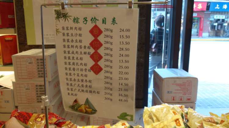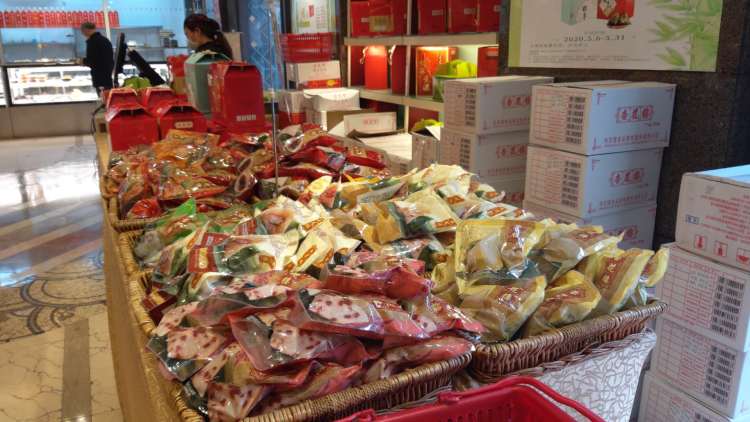 杏花楼福州路总店里,粽子礼盒与散装粽子摆满了柜台。