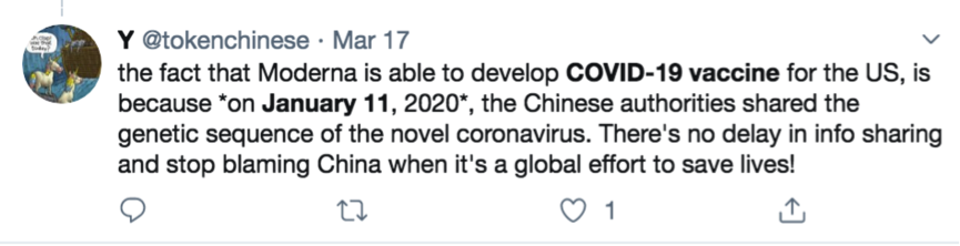 网民Y表示:“事实上生物制药公司Moderna有能力为美国进行新冠病毒疫苗研发,因为始于‘1月11日’,以及中国政府及时分享了基因序列。这就说明信息共享不存在延迟,再也不要指责中国说没有及时共享信息了,现在需要全球努力去救治生命!”↓↓↓