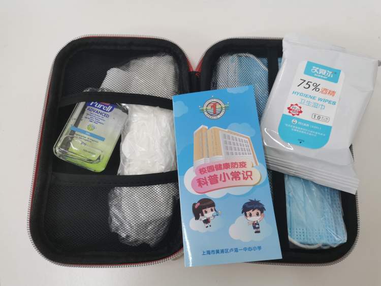 开学前所有学生的桌子上都配有防疫包,里面装了口罩、酒精湿巾等防疫物品,学生们开学即可拿到。↓