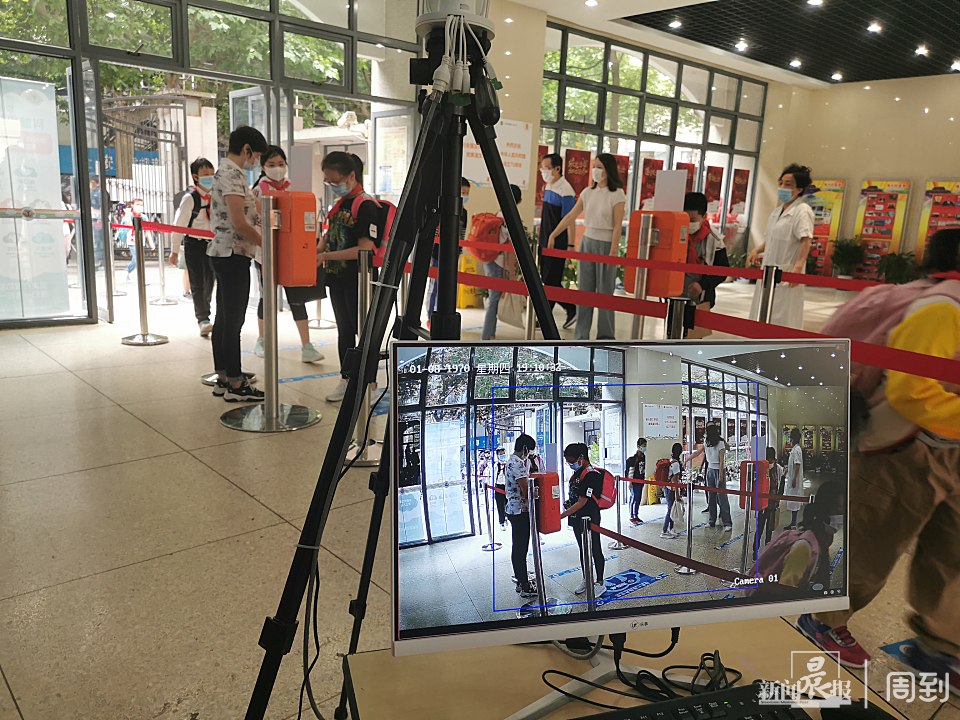 入口处的红外测温仪,将对每个入校的小朋友进行体温测量。进入测温区的孩子们,会在屏幕上自动显示对应的绿色体温数字,超过正常体温的,数字会变成红色,并且发出预警声音提示。