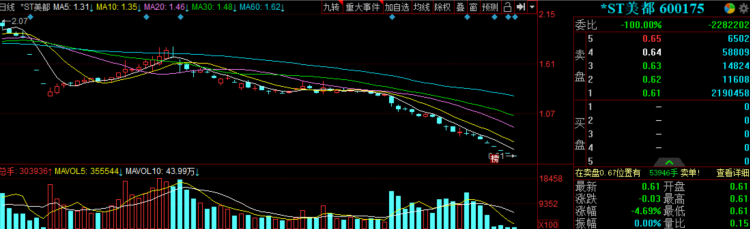 5月15日,*ST美都(600175)再度封跌停,收盘报0.61元。即便后续8个交易日每天都涨停,其股价也会低于1元,触及面值退市标准。*ST美都将成为今年面值退市第三家。截至今年一季度末,公司股东13万户,证金公司也中招。