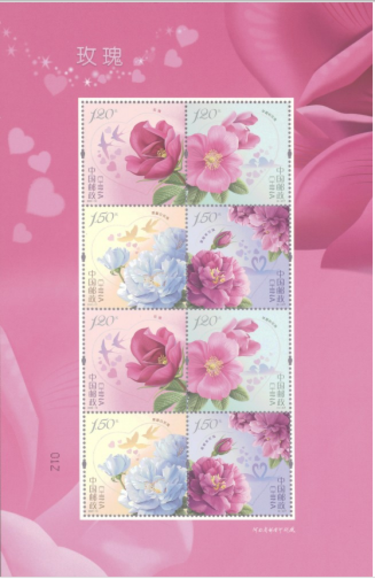 玫瑰在花语中代表着爱。玫瑰是优良的观赏植物,其花可食用、药用,亦可作为原料提取香精。该套邮票由河南省邮电印刷厂胶版工艺印制。三维立体击凸工艺使得邮票上的玫瑰花更加栩栩如生。