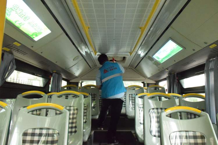 工作人员还上车对把手、座椅、扶杆等重点部位进行清洁和消毒,并对内滤网、新风换气装置消杀,“出场前车辆就已经进行清洁消杀工作,这里我们再消杀一下,确保万无一失。”