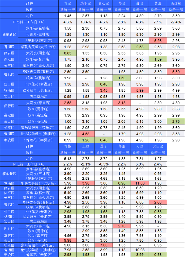 另外,今日超市13个蔬菜品种均价10涨3跌。涨幅最大的是鸡毛菜,相比昨天上涨了18.4%,今日均价为2.57元/500克;跌幅最大的是西红柿,相比昨天下跌2.4%,今日均价为3.59元/500克。