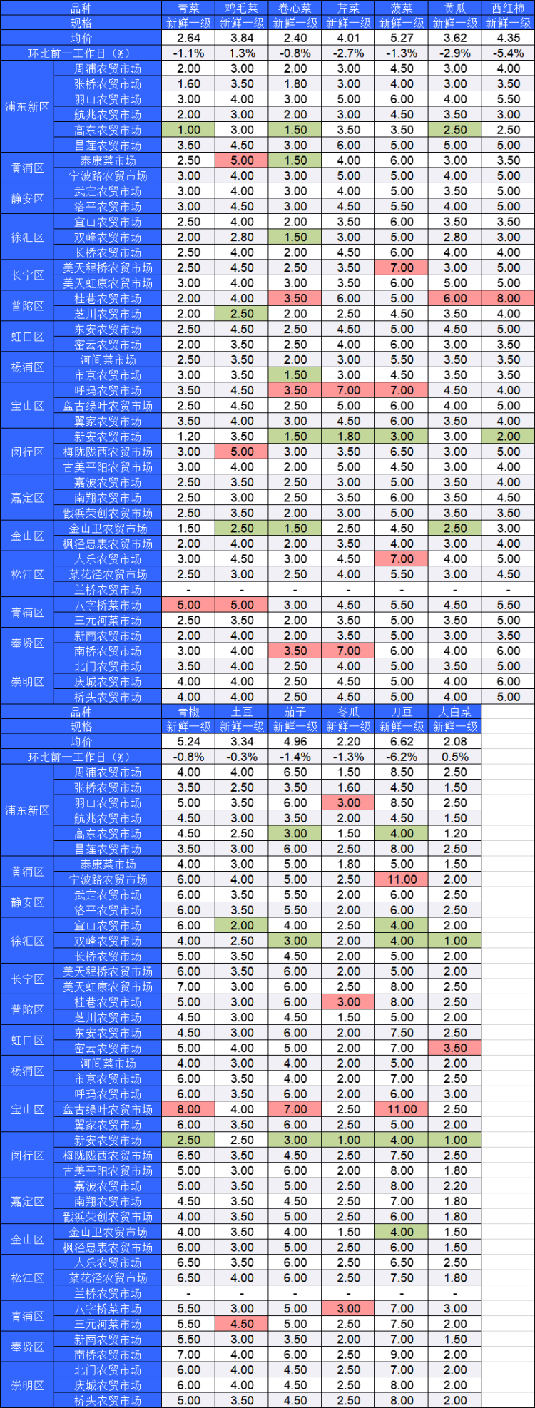 ■粉底标注代表该蔬菜品种在上述农贸市场或超市的最高价;绿底标注代表该蔬菜品种在上述农贸市场或超市的最低价