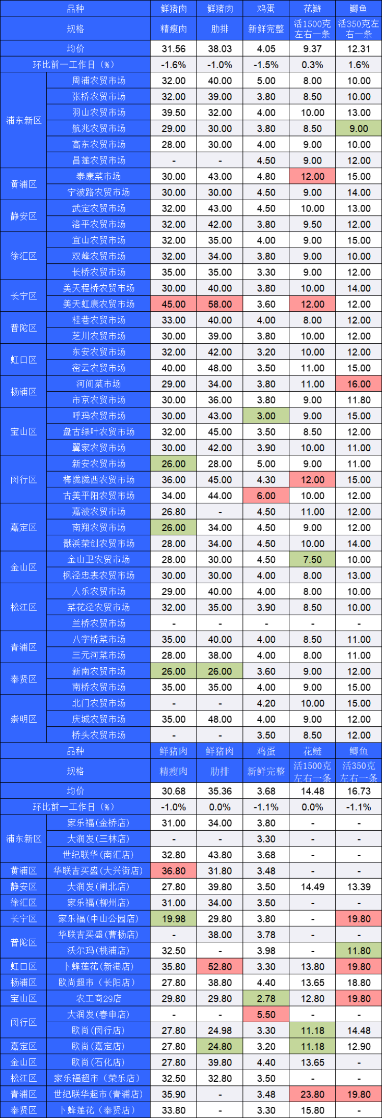 ■粉底标注代表该肉蛋鱼品种在上述农贸市场或超市的最高价;绿底标注代表该肉蛋鱼品种在上述农贸市场或超市的最低价