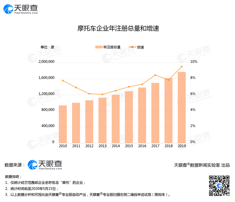 从成立时间来看,2010年-2013年,我国摩托企业增速有小幅下滑,2014年至今增速则波动上升。2019年,摩托企业同比增速创近十年来新高,为9.53%。2020年4月,我国新增摩托企业超2万家,环比增长约9.16%。
