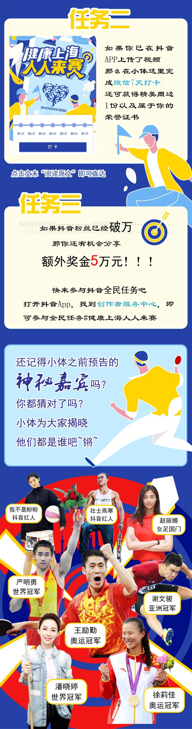 任务一:拍摄视频,选择本届市民运动会以下运动项目中任意一项或多项作为主要内容(乒乓球、羽毛球、网球、广播操、跆拳道、篮球、皮划艇、花样跳绳、极限运动、武术、路跑、体育舞蹈),视频可以是本人或多人合作完成,每个运动项目的展现方式可根据项目特点、个人或团队特色,以及录制现场环境实际情况适度展现。发布时请添加话题#健康上海人人来赛,并@上海体育 抖音政务号。参与的小伙伴即有机会获得最高4999元奖励,6月30日开奖。