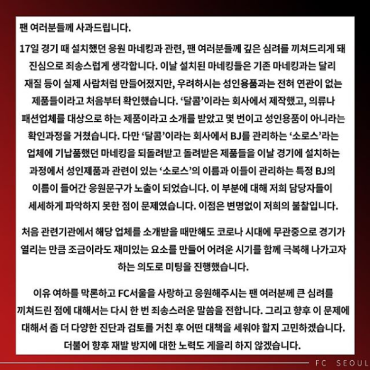 面对球迷们的质疑,首尔FC官方在今日向球迷致歉,并坚持称这群“球迷”与成人用品没有任何关系,“这来自于‘Sweet’公司生产的仿真玩偶,是时装公司的产品。”