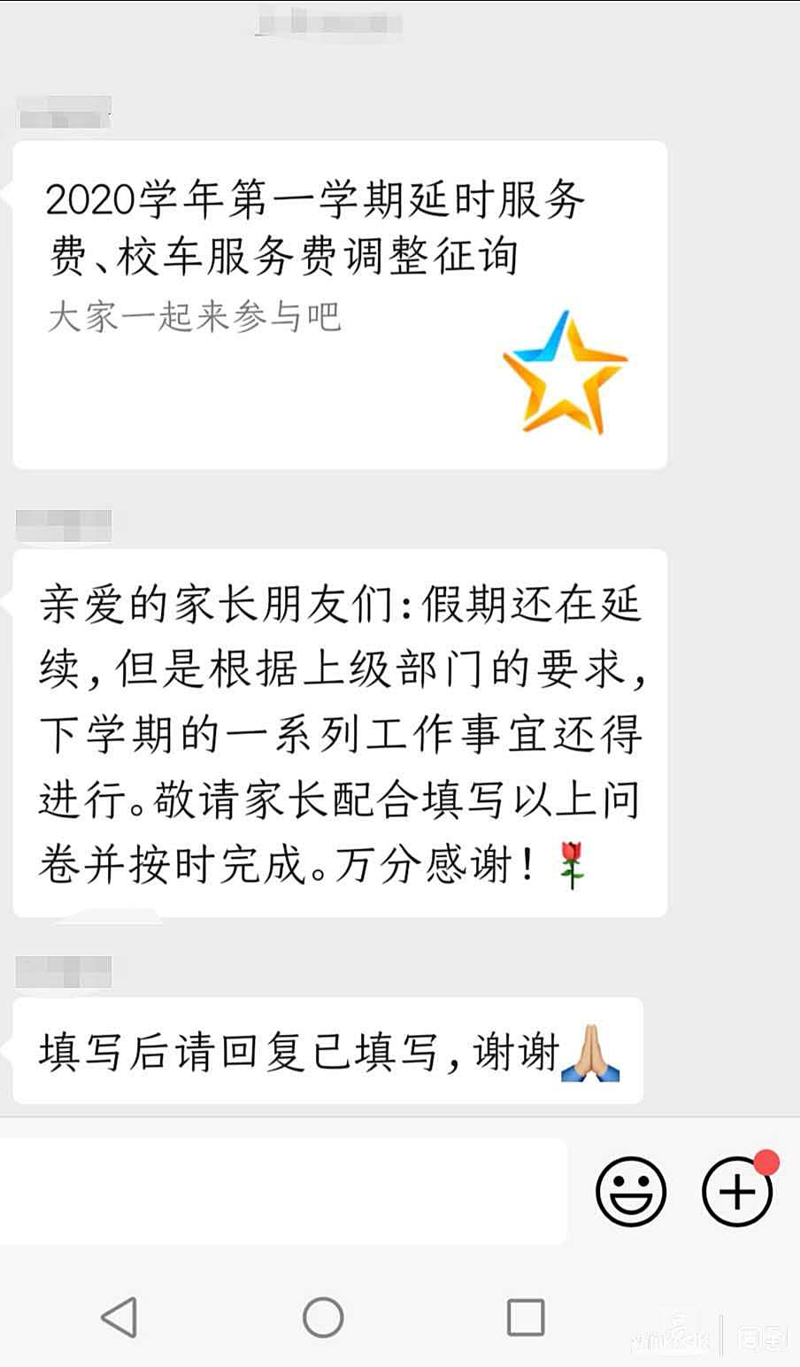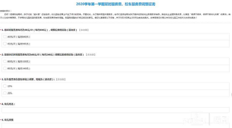 然而,闵行区协和实验幼儿园的家长们却有个小心结。此前,他们收到了一份《2020学年第一学期延时服务费、校车服务费调整》线上问卷。