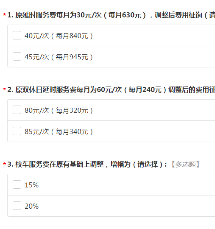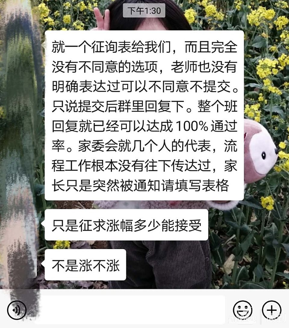 只是令一些家长感到不满的是,名为调价征询问卷,问卷中却只给出了不同价格涨幅的选项,甚至没有不同意调价的选项,征询变成了走过场,“家长们只是突然被通知填写表格,”对整件事情的流程也不清楚。换句话说,家长无法表达不同意见。