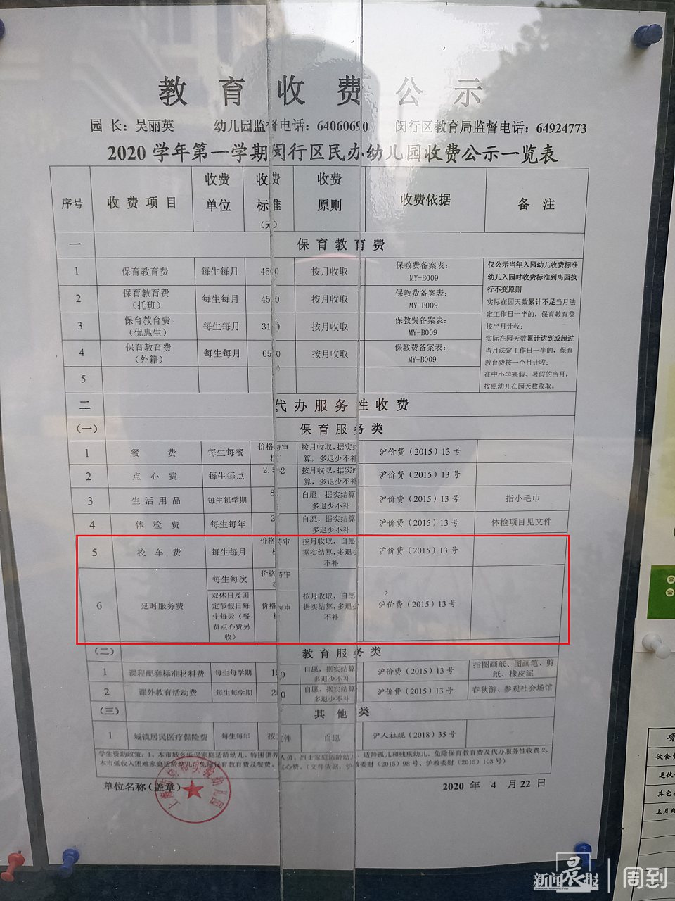2020学年第一学期收费表,红框中的校车和延时服务费价格还有待教育部门审核