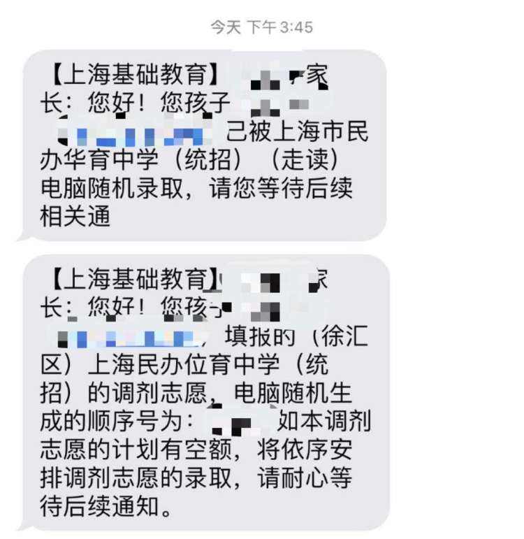 今天一早,贝贝妈就开始焦急地等待。上午黄浦率先公布民办摇号,贝贝妈看到朋友晒出的中选消息,又是羡慕又是焦灼,“简直是度日如年,一直在刷新徐汇教育局的官网”。索性,下午3点45分,她收到了摇中的短信通知,“是华育的通知先来的,后来又收到调剂志愿的顺序号,当时真的是喜极而泣!”