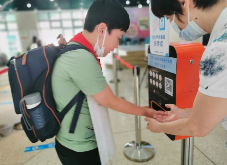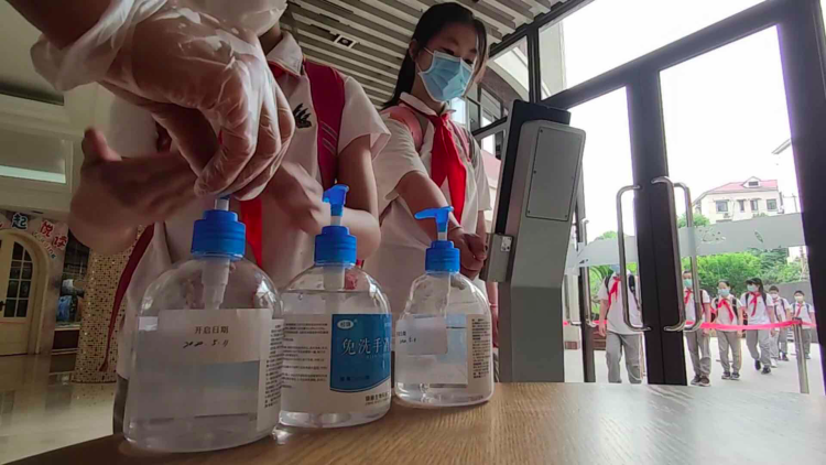 在黄浦区卢湾一中心小学,小朋友们系好红领巾、戴好口罩,带着自己的小水壶,乖巧地按要求排队入校,在老师的引导下通过只能雾化设备洗手消毒。