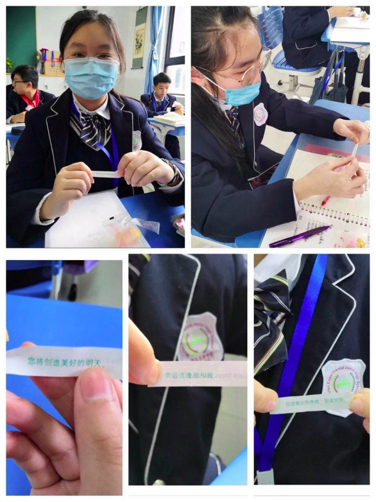第二节课间眼保健操同学位闭眼休息的时候,各个班级老师悄悄地在每个同学的桌子上摆上了一只“签语饼”。
