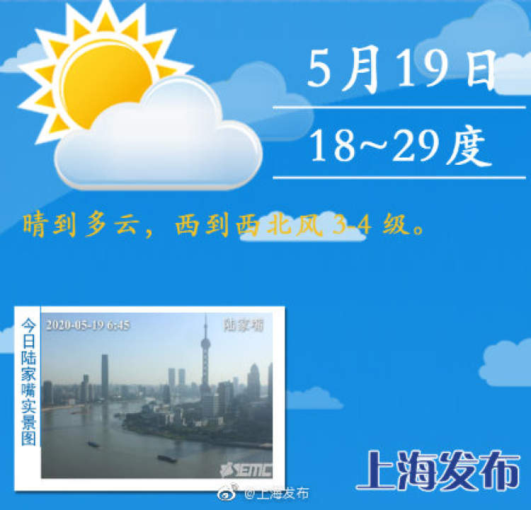 昼夜温差较大 白天日照充足,紫外线较强 周到君 2020-5-19 来源:周到上海 上海今天晴到多云,西到西北风3-4级。今天最高温度29度,最低温度18度。昼夜温差较大,大家注意早晚不要着凉了。 本周申城以晴或多云天气为主,阳光在线。气温略有波动,周四、周五气温略有下降,体感会舒适些,周六开始气温又一波上升,热度会继续跟上。近期天气不错,适宜洗晒哦。整体阳光较强,户外要多注意防晒和补水。 来源:周到上海 作者:周到君 赞一个 (0)