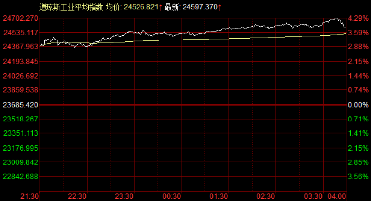 来看隔夜美股收盘的具体数据。至收盘,道琼斯工业平均指数上涨911.95点,涨幅3.85%,收报24597点;纳斯达克综合指数上涨220.27点,涨幅2.44%,收报9235点;标普500指数上涨90.21点,涨幅3.15%,收报2954点。