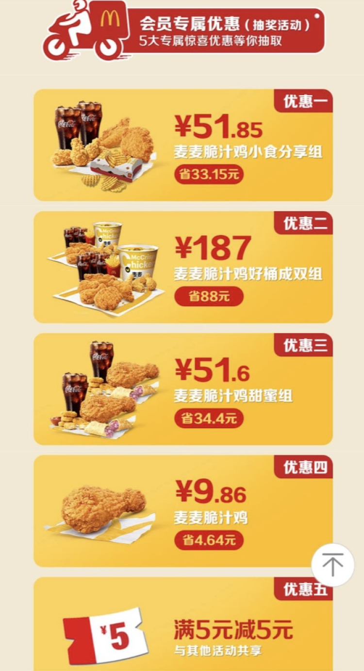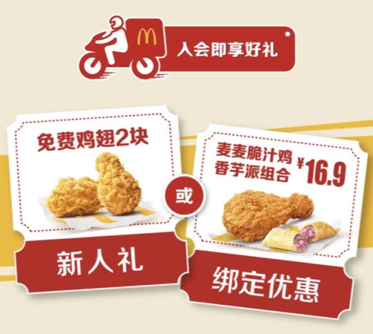 入会即享好礼。比如,新人可得免费鸡翅2块。麦麦脆汁鸡和香芋派组合仅16.9元。