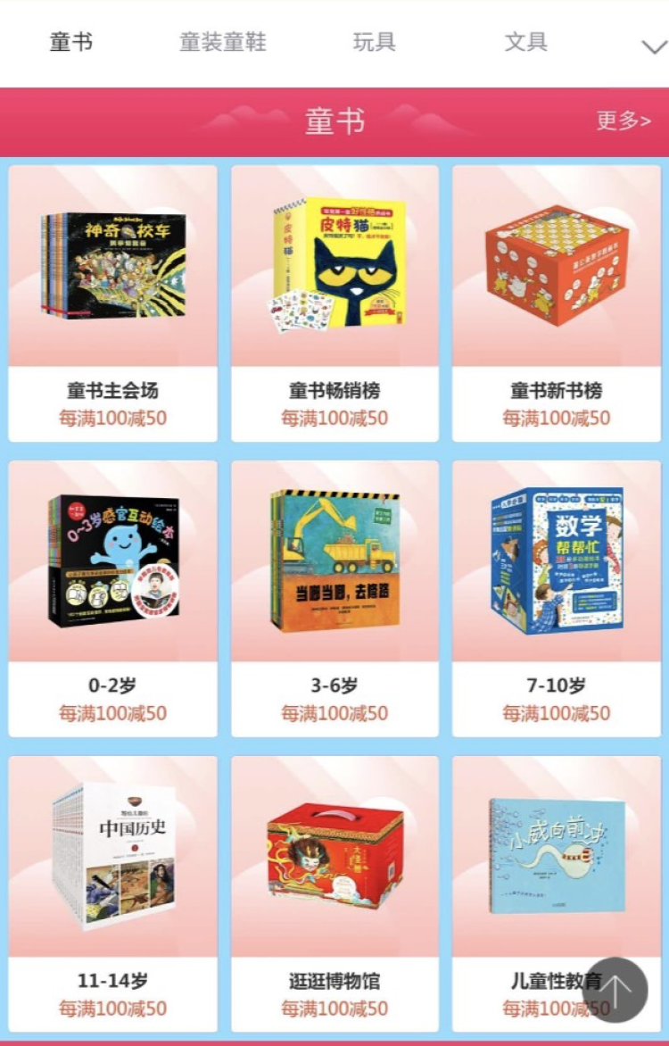 各类童书满100减50。童装童鞋、玩具、文具等也各有优惠。