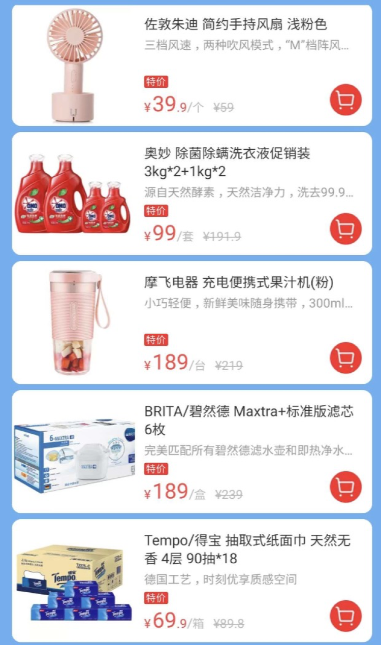 特价商品,优惠十分给力。佐敦朱迪简约手持风扇,单个降价近20元。奥妙除菌除螨洗衣液促销装加起来8公斤,特价仅99元一套,降价了九十多元。