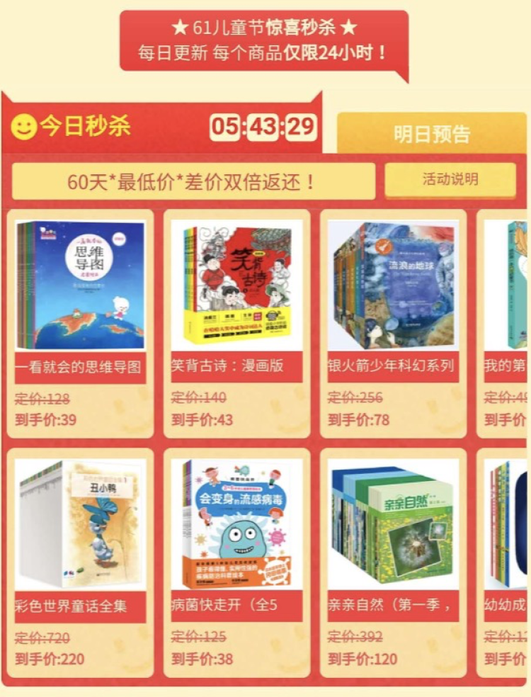 惊喜秒杀,每日更新。今天这些为孩子们准备的书籍折扣惊人,原价128元的“一看就会的思维导图”现在39元就可到手;原价140元的“笑背古诗漫画版”,43元就可到手。