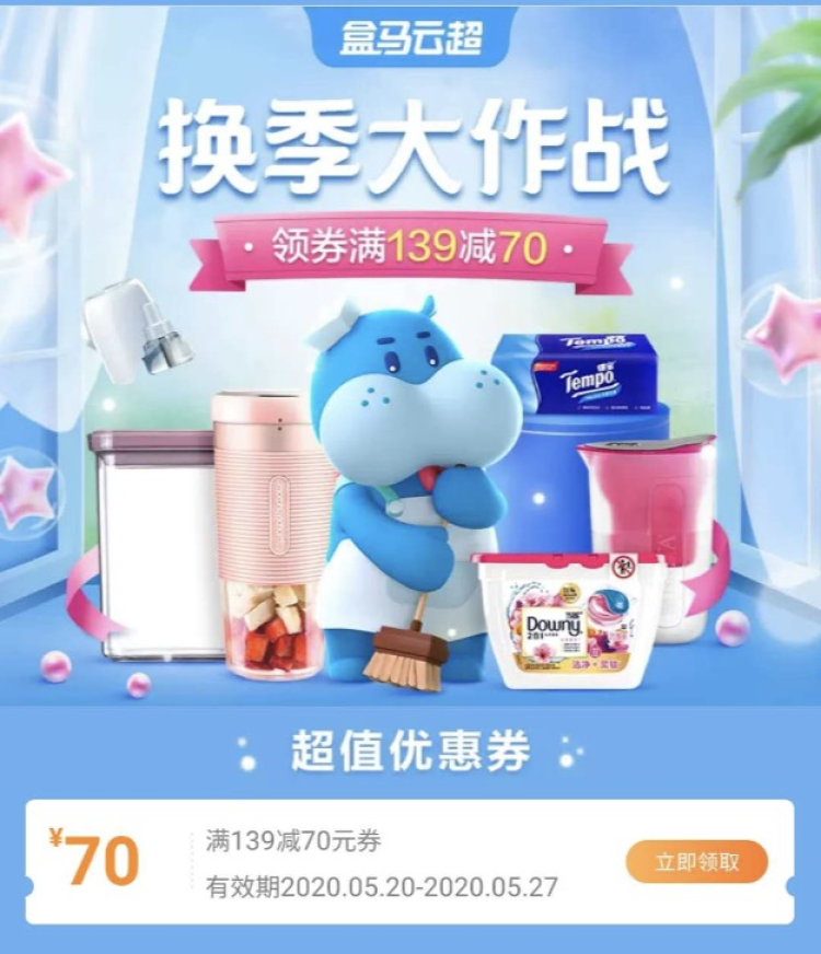 盒马云超换季大作战,领券满139减70。