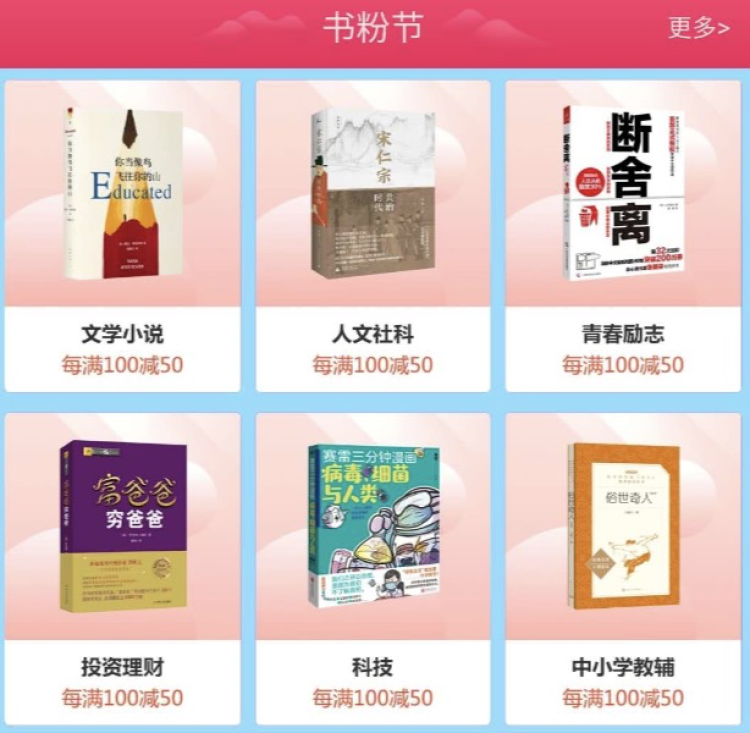 不止童书,其他许多种类的书籍也有每满100减50的“书粉节”活动。