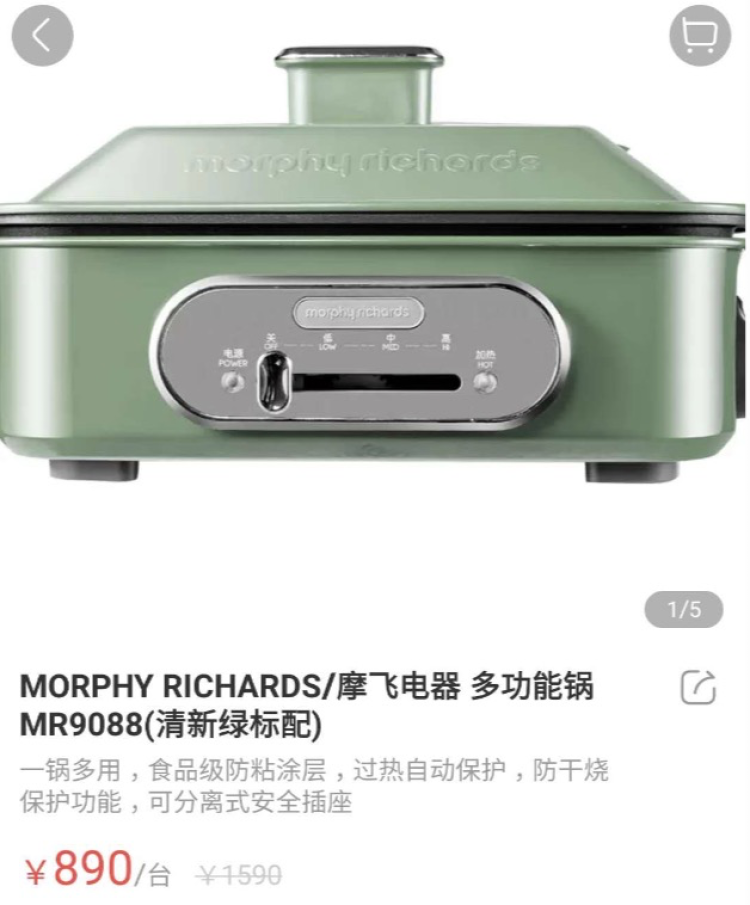 降价比较猛的,比如这个摩飞电器多功能锅MR9088(清新绿标配),原价1590元,现价仅890元一台,直降700元。