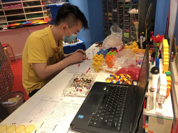今天上午,在上海乐高探索中心的乐高创意工作室里,一位乐高模型拼砌大师正在埋头拼搭着一份“爱心”形状的乐高模型。摆在他前面的,还有许许多多其他不同颜色的爱心成品。橘、黄、绿、粉、蓝、紫,一排排地站好队形。