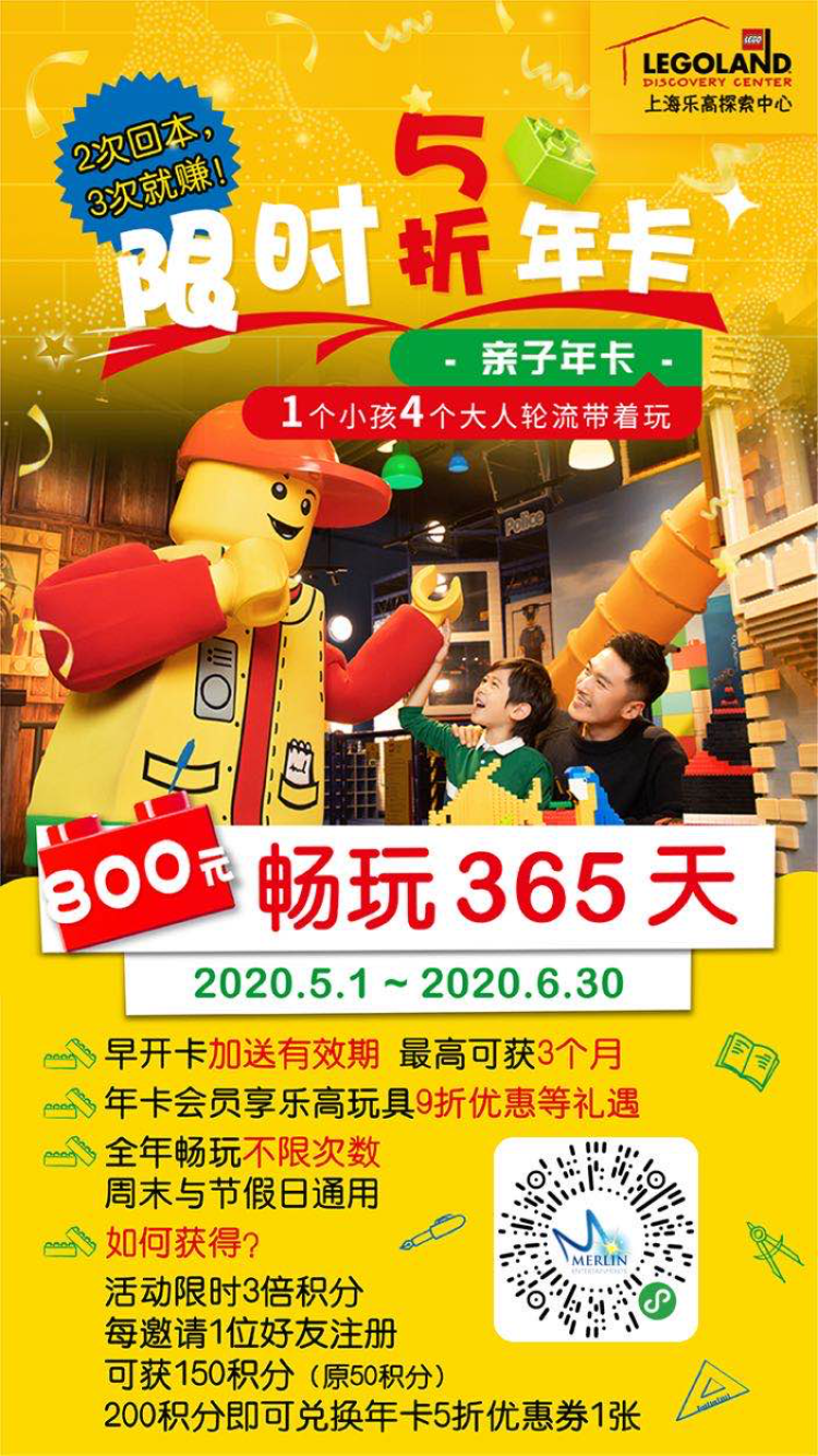 就今天,上海乐高探索中心给周到君推出了2020特惠亲子年卡限时五折价800元/张(原价1600元/张)