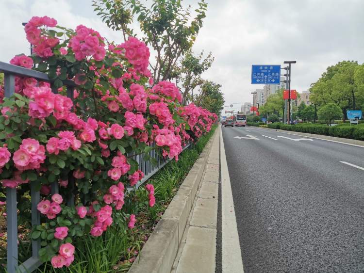 江月路是浦锦街道东西向的主干道之一,2018年,街道对江月路中央隔离带实施景观提升,逐步将地被调整为月季,同时,对护栏也用月季进行美化。通过两年的精心养护,如今,走在江月路上,便可见绵延近2公里的月季开得层层叠叠。