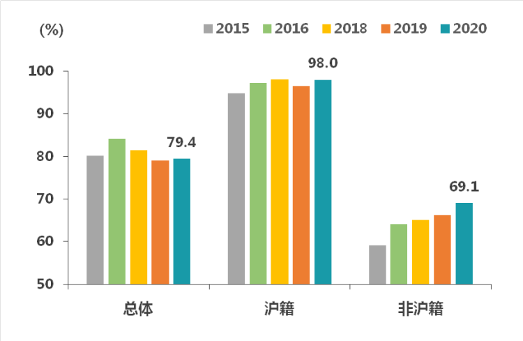 虽然由于疫情影响,非沪籍毕业生暂时无法返校,在上海求职的困难增加,但是选择留沪的比重仍较去年有所上升,2015年至2020年提高了10.0个百分点,平均每年提升2.0个百分点。
