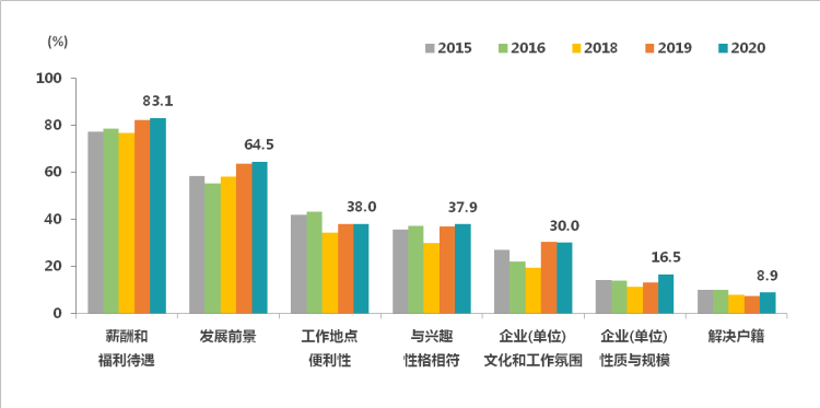 毕业生对“薪酬和福利待遇”硬条件与“发展前景”软条件的重视程度继续上升,对这两个因素的重视远高于其他因素。调查结果显示,83.1%的毕业生看重“薪酬和福利待遇”,比2015年上升5.7个百分点;64.5%看重“发展前景”,上升6.1个百分点。从两大因素来看,毕业生对于“薪酬和福利待遇”这类“硬条件”的重视程度明显高于“发展前景”等“软条件”。户籍因素并不是多数毕业生重点考虑的因素,仅有8.9%的毕业生看重“解决户籍”。