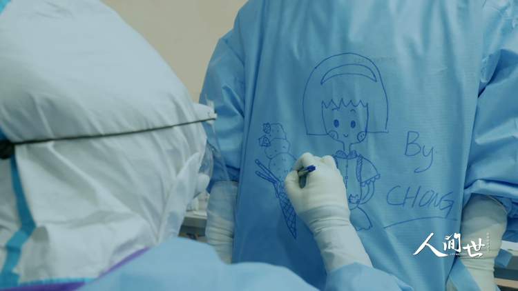 防护服、口罩、护目镜、面罩,层层包裹之下,每一张脸都如此模糊。彼此只能通过防护服背面的图案和名字来辨识。这不仅仅是他们独一无二的标签,更是给自己的勇气。