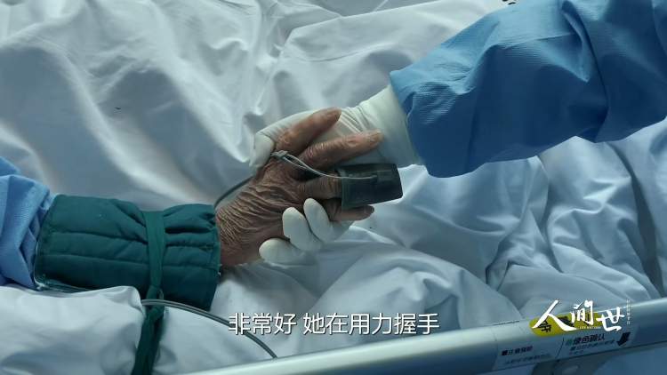 护士俞英一遍遍地拨打老人家属电话。电话终于接通时,她像个雕塑一样站在床边举着电话,一个姿势整整维持了十分钟,而奶奶也紧紧握着她的手不放。在护士为她视频连线后,她终于平复下来,甚至对医生说了一句:“对不起”。