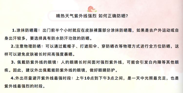 气象部门提醒,晴热天气紫外线强烈,请注意正确防晒。
