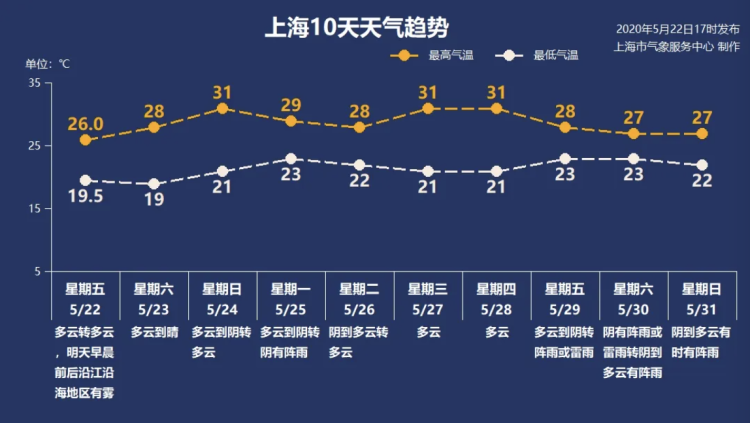 周日多云到阴,天空有时显得比较阴沉,风力减小,东南风3-4级;气温进一步上升,21-31℃,体感更热一些。