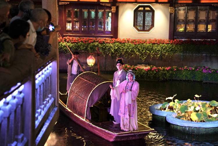 将九曲桥变身实景秀场的船秀表演,除了保留去年夜经济活动中颇受欢迎的琵琶、竹笛等演奏节目外,今年特别增加了昆曲表演。年轻靓丽的昆曲演员在亭台楼阁和荷花掩映烟波画船间唱上一曲游园惊梦,引来一众市民和游客在九曲桥畔鼓掌叫好。