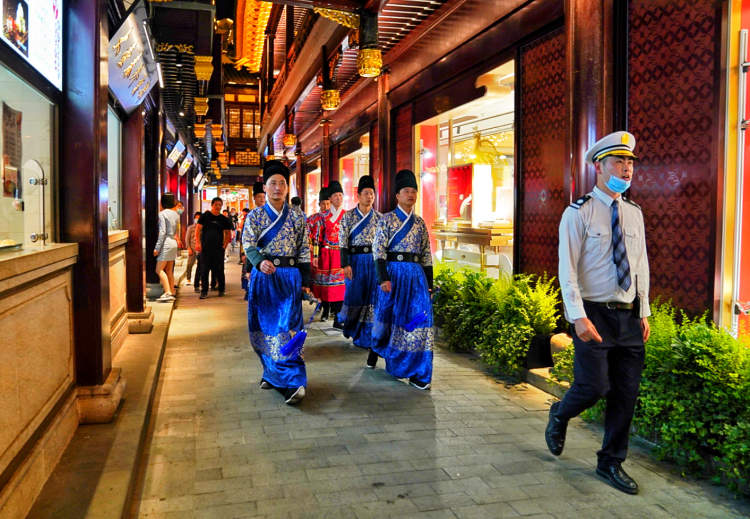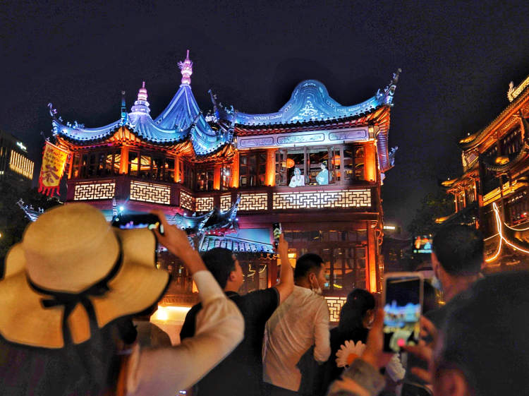 晚上去绿波廊或者上海老饭店品一品地道的上海菜后,豫园的夜晚华灯初上,热闹非凡的夜间演艺活动和夜间集市也拉开帷幕……