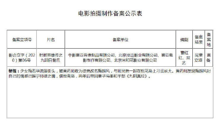 公示表显示,电影名为《射雕英雄传之九阴白骨爪》,由曹红红、双艺担任编剧,故事讲述了少女梅若华流落街头,被黄药师收为徒弟改名梅超风,与师兄弟一起在桃花岛上习武长大。黄药师发现梅超风对自己的情感已超乎师徒之情,借故离岛,两年后带回妻子冯蘅和半部《九阴真经》。