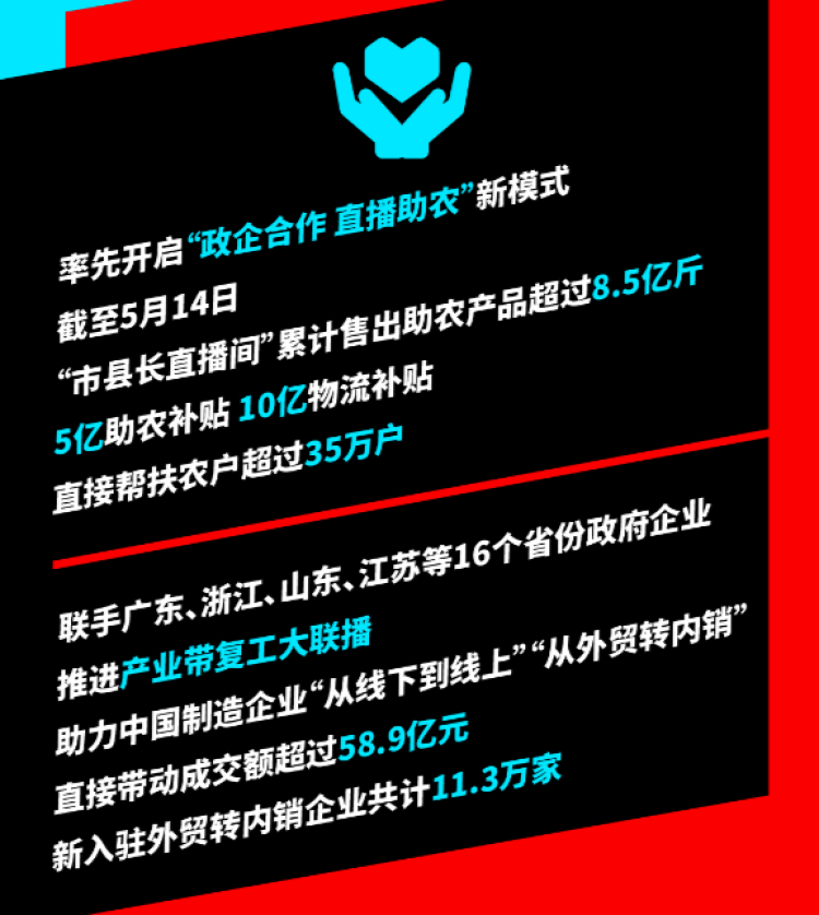 期间,拼多多率先开启了“政企合作 直播助农”“产业带复工大联播”等一系列创新模式,帮助农户、企业解决实际问题。截至5月14日,拼多多“市县长直播间”累计带动助农产品销量超过8.5亿斤,直接帮扶农户超过35万户。