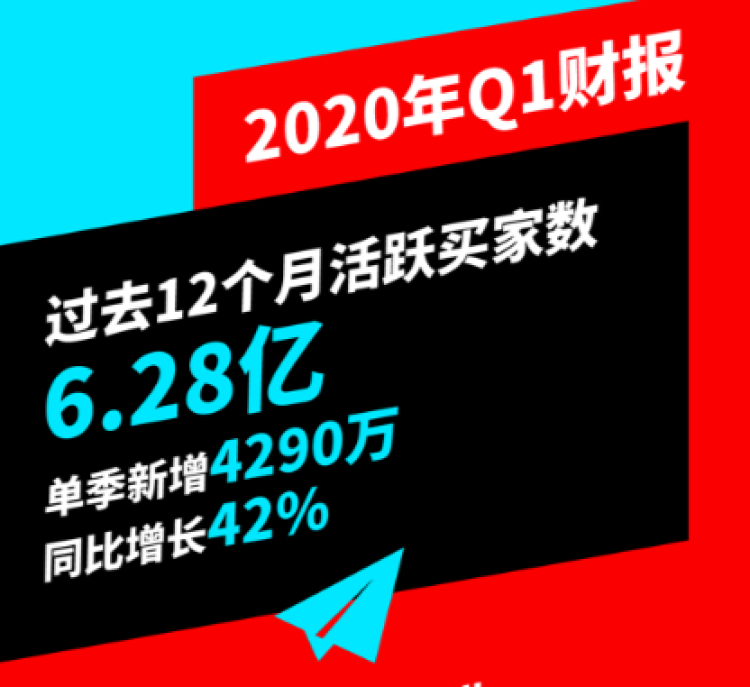财报显示,拼多多Q1营收为65.4亿元,同比增长44%,市场预期49.69亿元。截至2020年3月31日的前12个月内,拼多多的年度活跃买家数达6.28亿,单季度劲增4290万。与2019年同期相比,活跃买家数更是增加了1.85亿。