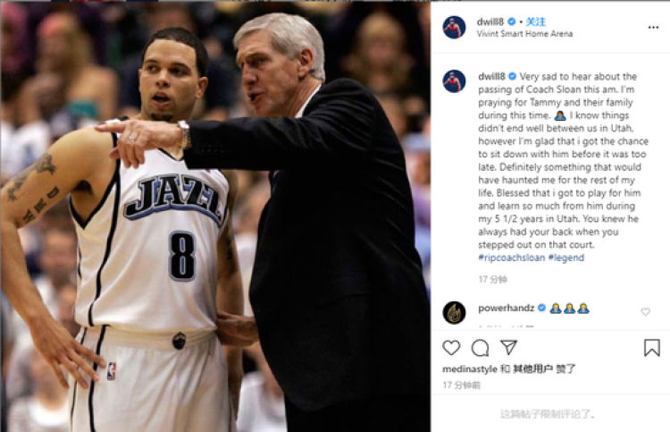 今天早晨听到斯隆教练去世的消息之后,我悲痛万分。为Tammy以及他们的家人祈祷。我知道当年在犹他我们之间的故事结局不尽人意,但我很高兴能够在一切都为时已晚之前有机会与他坐下来冰释前嫌。这件事情注定将在我余生当中一直萦绕在我的心头。我很荣幸能够在犹他为他效力五年半时间,我从他身上学到了太多东西。当你离开球场时,他总是会站在你身后支持你。安息吧,斯隆教练。