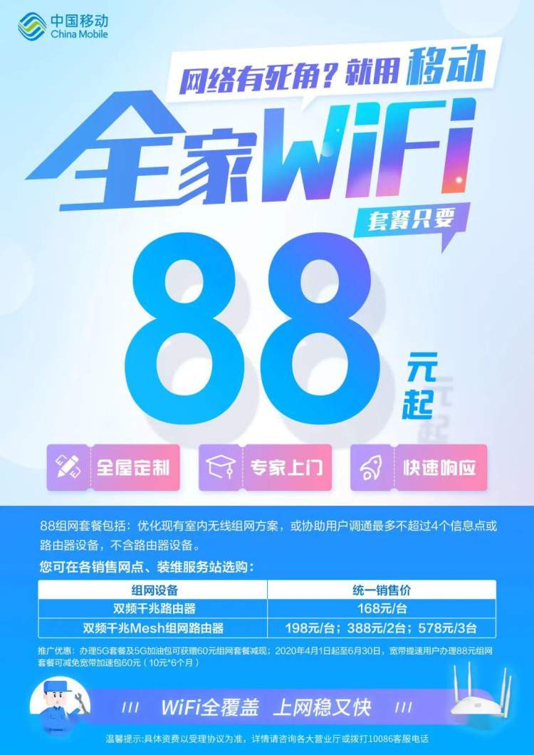 移动的“全家WiFi”服务,88 元套餐包含优化现有室内无线组网方案,协助用户调通最多不超过 4 个信息点或路由器设备,路由器的价格不包含在内。