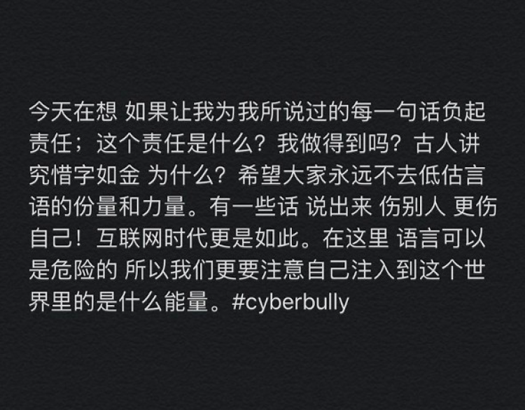 她写道:“今天在想,如果让我为我所说过的每一句话负起责任;这个责任是什么?我做得到吗?古人讲究惜字如金为什么?希望大家永远不去低估言语的分量和力量。有一些话,说出来伤别人更伤自己!互联网时代更是如此。在这里语言可以是危险的,所以我们更要注意自己注入到这个世里的是什么能量。#cyberbully(网络欺凌)”