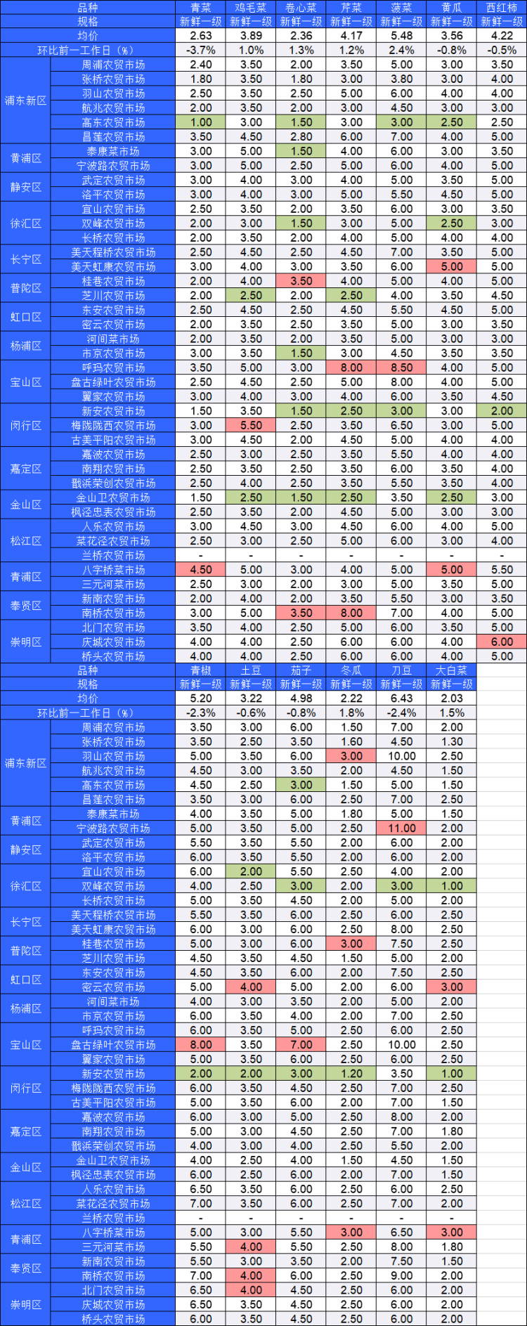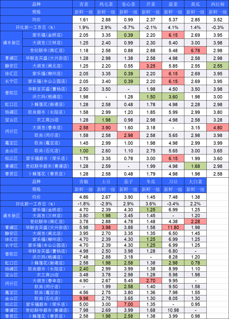 ■粉底标注代表该蔬菜品种在上述农贸市场或超市的最高价;绿底标注代表该蔬菜品种在上述农贸市场或超市的最低价