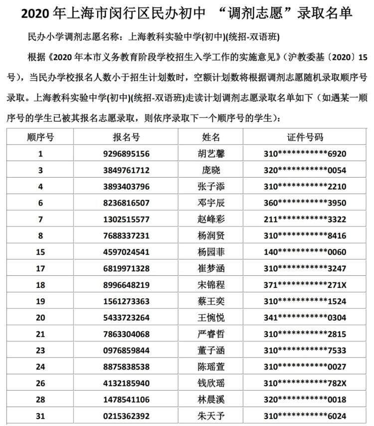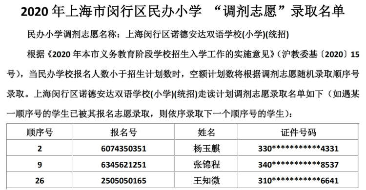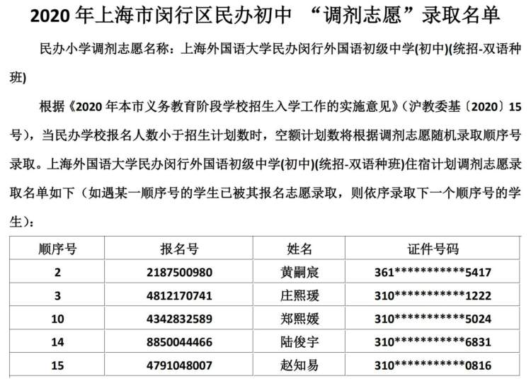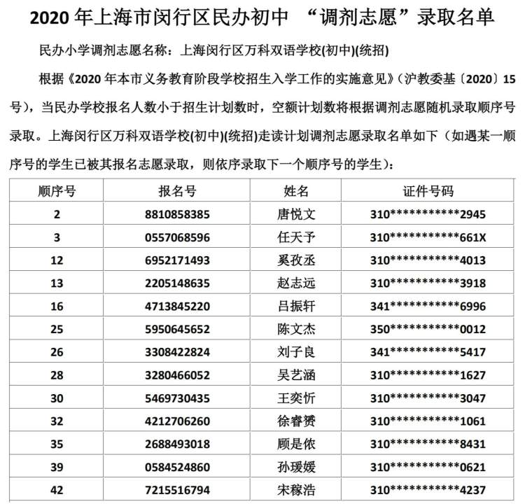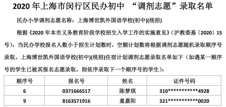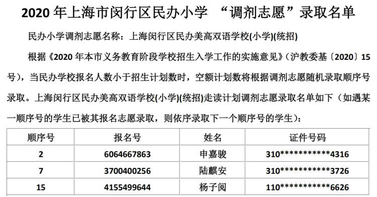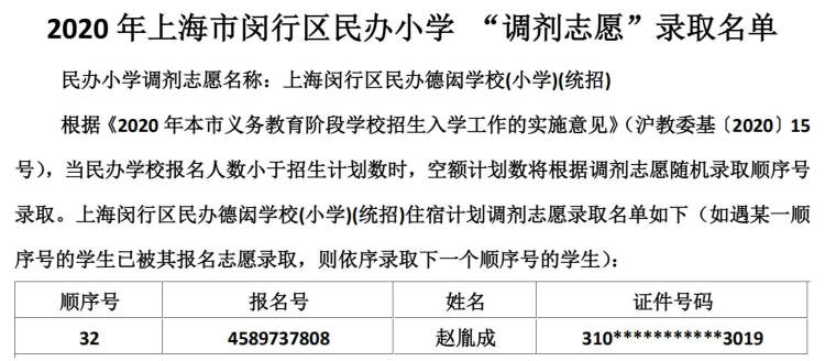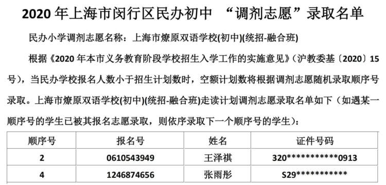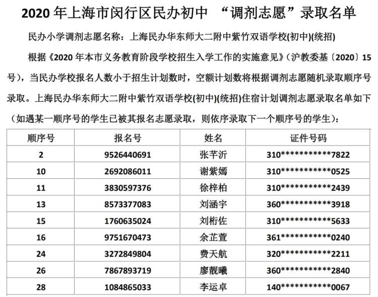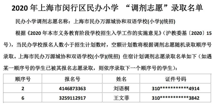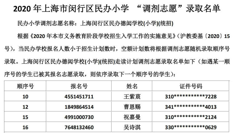闵行区民办小学、初中“调剂志愿”录取结果公布啦 徐斌忠 2020-5-25 来源:周到上海 闵行区教育局在其官网公布了2020年该区民办小学、中学“调剂志愿”录取结果。 根据《2020年本市义务教育阶段学校招生入学工作的实施意见》,当民办学校报名人数小于招生计划数时,空额计划数将根据调剂志愿随机录取顺序号录取。 闵行区民办小学调剂志愿录取名单: 闵行区民办初中调剂志愿录取名单: 来源:周到上海 作者:徐斌忠 赞一个 (0)